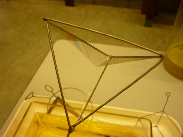 Si vede che la soluzione di acqua e sapone forma nelle parti vuote delle sagome delle lamine liquide aventi la minima superficie possibile. Tale effetto è dovuto alle forze di attrazione tra le molecole della soluzione (tensione superficiale).