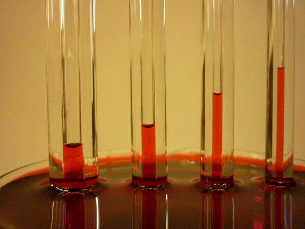 In una bacinella piena di liquido rosso vengono inseriti quattro tubicini di vetro di diverso diametro e si osservano le altezze raggiunte dal liquido nei diversi tubicini.