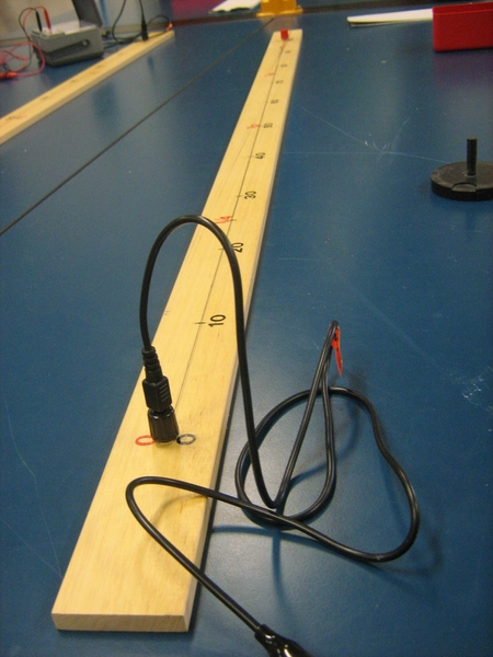 1. Collegare in serie, tramite i cavetti, una batteria, una lampadina e il filo a lunghezza variabile (nikel-cromo). Chiudere il circuito tra la batteria e il filo tramite il cavetto con il cilindro di ottone. Posizionare il cilindretto a diverse lunghezze del filo, variandone quindi la porzione percorsa da corrente. Osservare come l'intesità luminosa della lampadina diminuisce all'aumentare della lunghezza del filo.