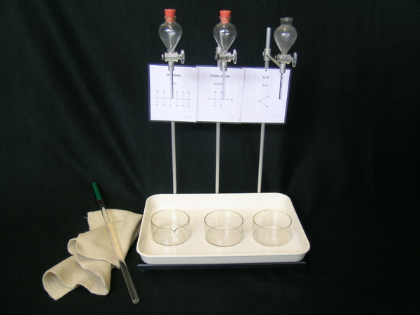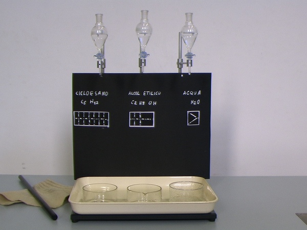 Si posizionano sopra una bacinella tre burette riempite rispettivamente di acqua, alcool etilico e cicloesano, chiuse alla base. Si carica per strofinio una bacchetta e si aprono una alla volta le burette. Si osserva cosa accade al liquido che fuoriesce quando vi si avvicina la bacchetta carica.
