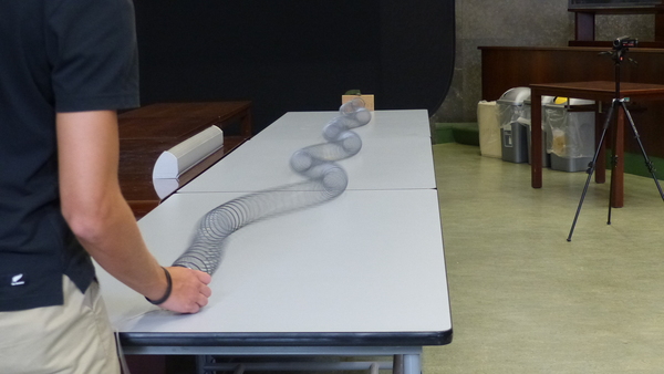 Una molla Slinky, posta sopra un tavolo, viene fissata a un’estremità e dall’altra parte viene allungata tramite un filo. La si fa oscillare lateralmente con la mano prima all’estremità mobile (collegata al filo) e poi a quella fissa. Infine, la molla viene compressa e lasciata andare di colpo. In tutti e tre i casi si osserva la propagazione della perturbazione nella molla.