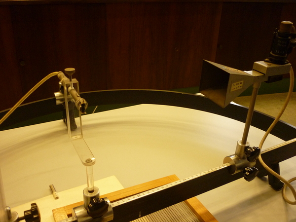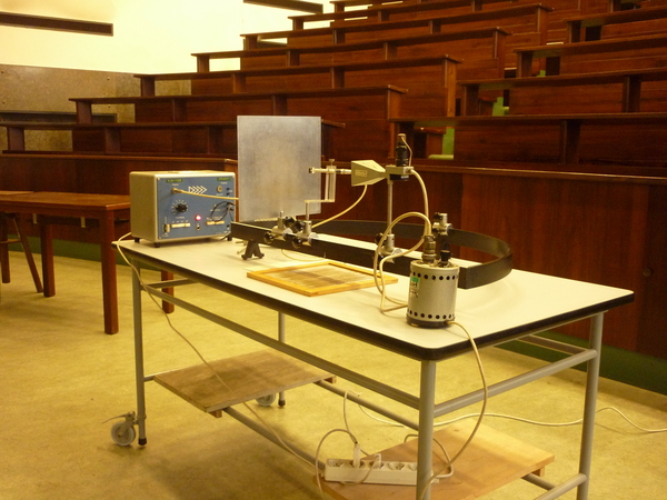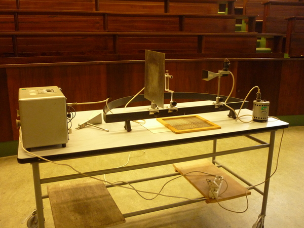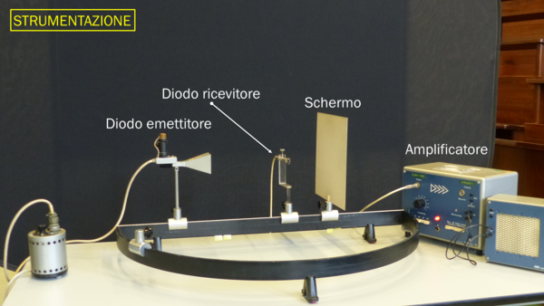 Su un supporto semicircolare vengono posizionati un diodo emettitore, un diodo ricevitore e uno schermo. Il diodo ricevitore è collegato a un altoparlante. Lo schermo posto di fronte al diodo emettitore porta alla formazione di onde stazionarie, le cui caratteristiche vengono studiate spostando il diodo ricevitore.