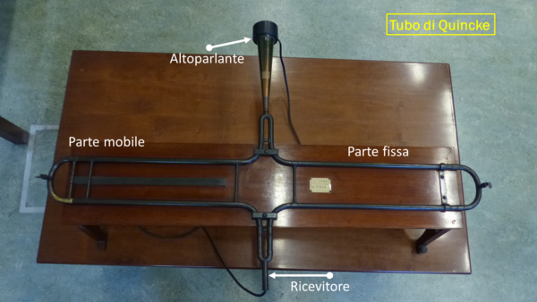 Il tubo di Quincke è formato da due tubi a U, di cui uno di lunghezza variabile, le cui estremità sono collegate tra loro. Un’onda sonora viene prodotta a una delle estremità dei tubi e rilevata all’altra estremità da un ricevitore provvisto di altoparlante. Si ascolta il suono prodotto quando i due tubi hanno la medesima lunghezza e quando uno dei due viene allungato.