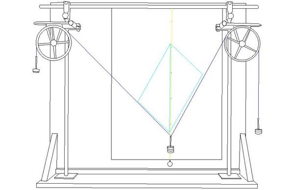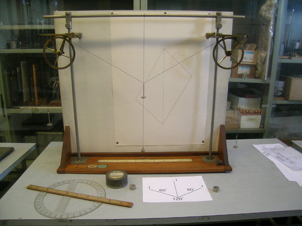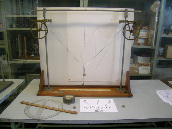 Si appendono alle due estremità di un cordoncino sospeso fra due pulegge due pesi campione uguali in modo che un occhiello inserito nel cordoncino si trovi esattamente al centro. All'occhiello si applica un peso uguale ai pesi posti alle estremità e si misura l’angolo che si viene a formare nel filo. In seguito, si applicano alle due estremità, rispettivamente, 3 e 4 pesi campione, mentre al centro vengono appesi 5 pesi. Anche in questo caso si misura l’angolo che si forma nel filo in condizioni di equilibrio statico. Si possono effettuare altre prove con diverse combinazioni di pesi e misurare gli angoli corrispondenti.