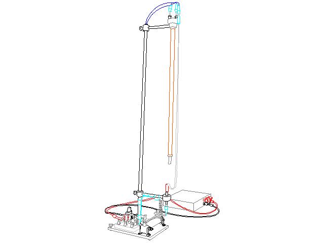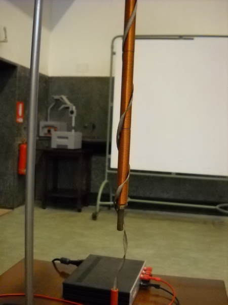 Su un supporto vengono appesi un elettromagnete e un nastro metallico, vicini e paralleli. Il solenoide dell’elettromagnete e il nastro conduttore vengono entrambi alimentati con corrente continua e si osserva come interagiscono.