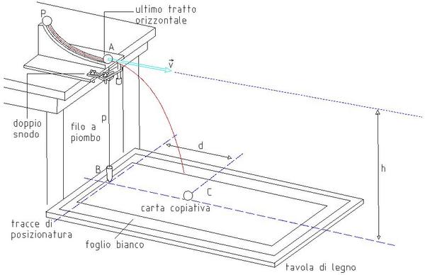 Prendere la cassetta di legno e porre al suo interno il foglio bianco. Mettere poi il foglio di carta copiativa sopra il foglio bianco. Porre la cassetta di legno sopra lo sgabello e avvicinarlo al tavolo sopra il quale abbiamo sistemato la guida metallica. Lo sgabello deve essere regolato in modo tale che la cassetta sia adiacente alle gambe del tavolo. Lasciare cadere la sferetta dal punto più alto della guida. Misurare quindi la distanza verticale tra il piano del tavolo e la base della cassetta, e la distanza orizzontale tra il bordo del tavolo e l'impronta che la sferetta ha lasciato sul foglio bianco in seguito alla caduta. Abbassare lo sgabello e ripetere l'esperimento. Appoggiare infine la cassetta di legno sul pavimento e lasciare cadere nuovamente la sferetta, misurando ancora entrambe le distanze. Con tutte le coppie di distanze misurate è ora possibile tracciare un grafico che rappresenti la traiettoria della sferetta.