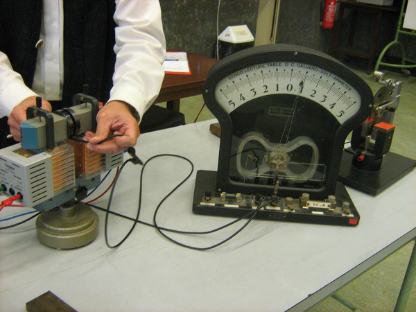 Un lungo filo flessibile viene collegato tramite dei morsetti a un amperometro. Il filo viene fatto passare con una certa velocità tra i due poli di un elettromagnete e si osserva cosa segna l’amperometro. Successivamente si fanno diverse prove avvolgendo il filo in vari modi.