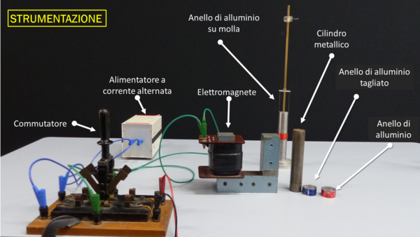 Si inserisce verticalmente un cilindro di ferro all’interno di una bobina che può essere di volta in volta alimentata, tramite un commutatore, con corrente continua o alternata. Un reostato permette di regolare l’intensità della corrente. Si preparano poi due anelli di alluminio, di cui uno tagliato lungo una generatrice. Si infila il primo anello nel cilindro di ferro e si alimenta la bobina con corrente continua, osservando cosa succede. Successivamente si utilizza la corrente alternata e si nota cosa cambia rispetto al caso precedente. Infine, le medesime esperienze vengono ripetute con l'anello tagliato.