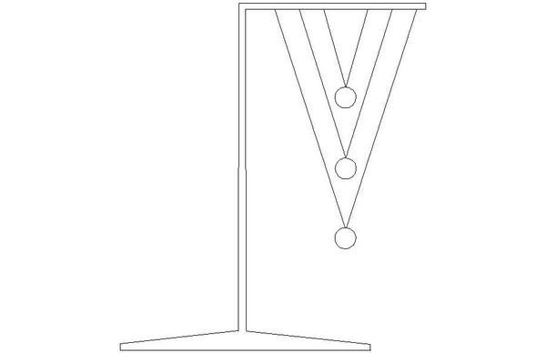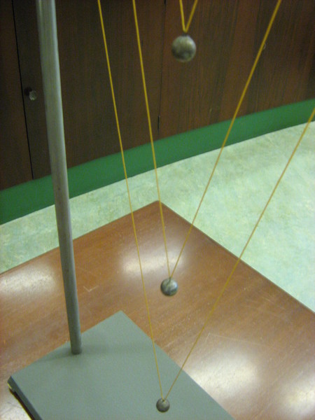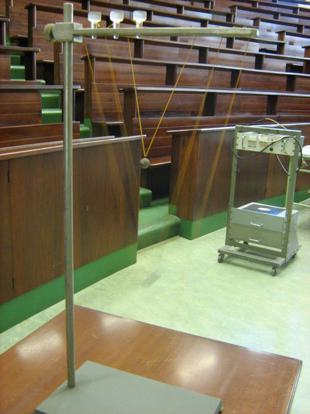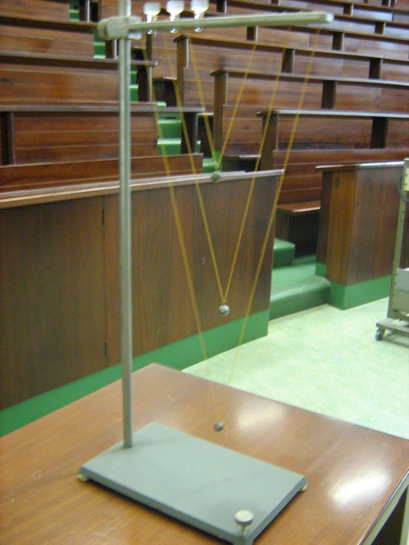 Tre pendoli di diversa lunghezza sono sospesi uno sopra l’altro. I tre pendoli vengono messi in oscillazione contemporaneamente e si confrontano le durate di oscillazione.