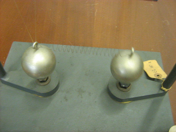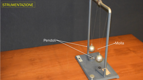 Due pendoli di uguale massa e lunghezza sono collegati tra loro tramite una molla. Il primo pendolo viene messo in oscillazione e si osserva cosa succede.