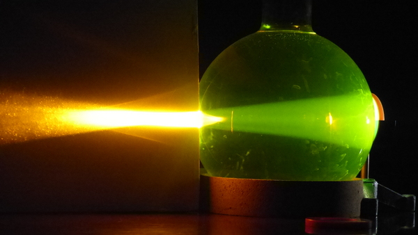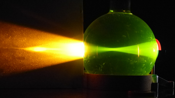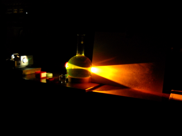 Un’ampolla di forma sferica, riempita di acqua e fluoresceina, viene utilizzata per mostrare i più comuni difetti dell’occhio.